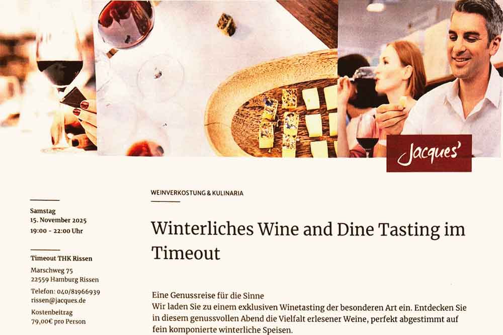 ![]() WEINVERKOSTUNG & KULINARIA Winterliches Wine and Dine Tasting im Timeout – eine Genussreise für die Sinne . Wir laden Sie zu einem exklusiven Winetasting der besonderen Art ein. Entdecken Sie in diesem genussvollen Abend die Vielfalt erlesener Weine, perfekt abgestimmt auf fein komponierte winterliche Speisen. In gemütlicher Atmosphäre servieren wir Ihnen ein Tischbuffet aus saisonalen [...]